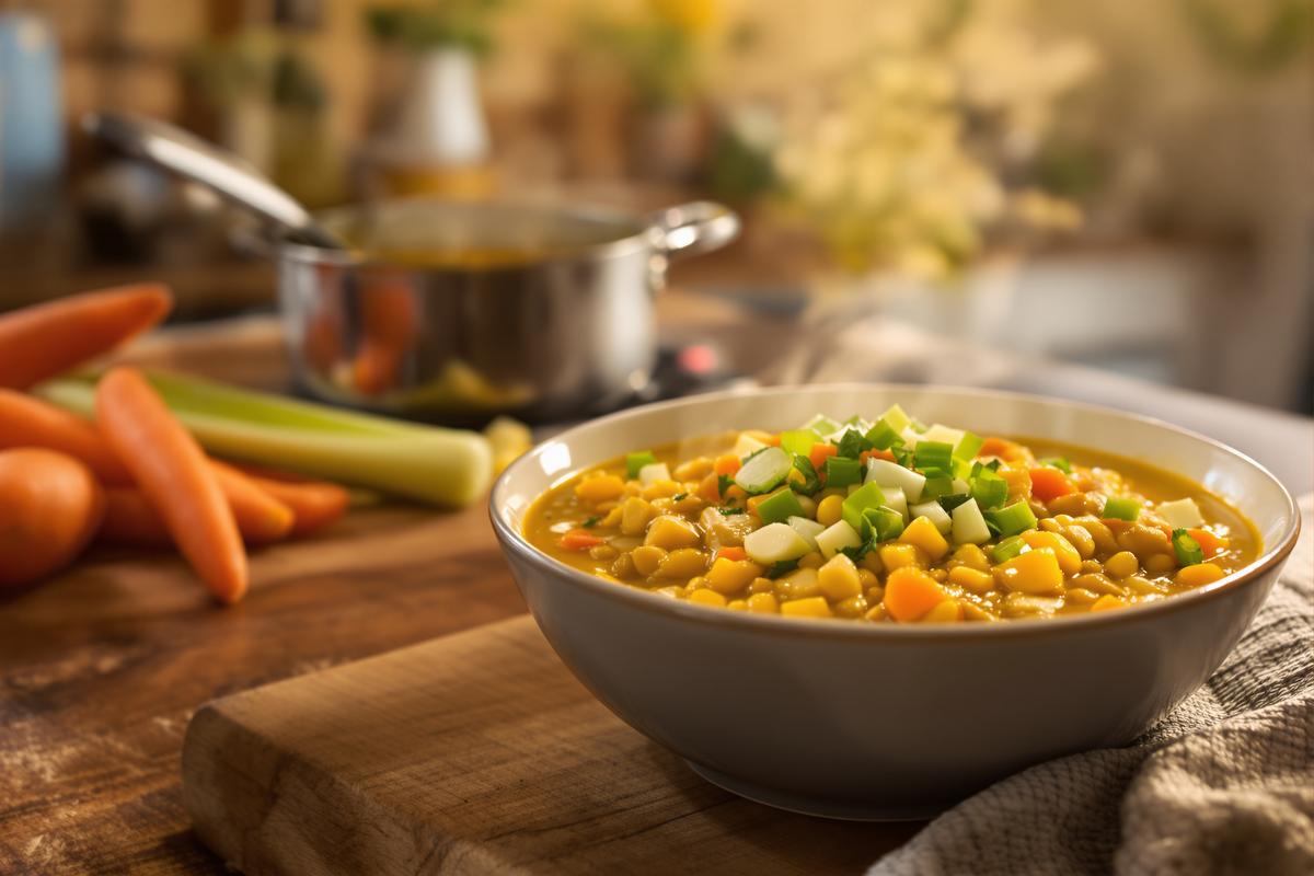 • 1. Vorbereitung: Spüle die Linsen gründlich unter kaltem Wasser ab. Lass den Mais abtropfen. Schäle die Karotten und schneide sie in kleine Würfel. Schneide auch Sellerie, Zwiebel und Knoblauch in feine Stücke. Die Frühlingszwiebeln sowie optional etwas Ingwer fein hacken und zur Seite legen.