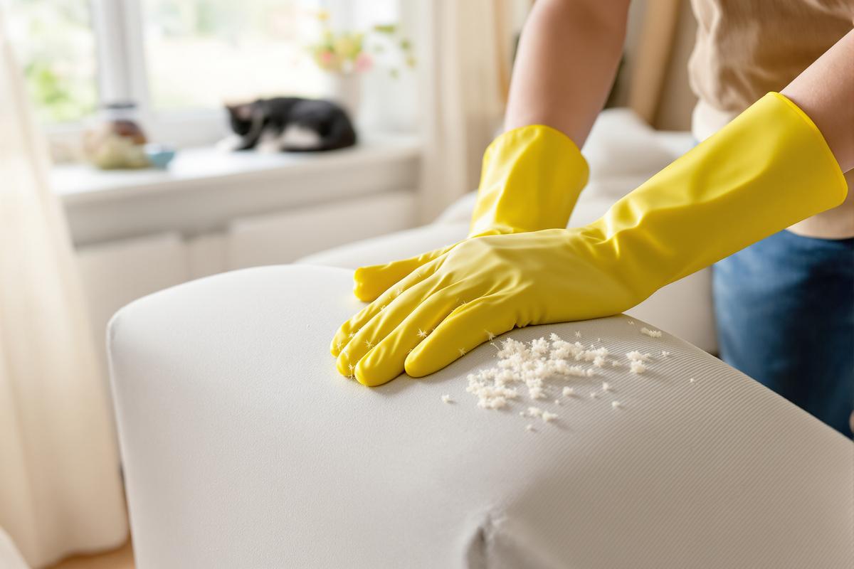 Du brauchst keine neue Ausstattung oder teuren Spezialreiniger. Mit einem einfachen Gummihandschuh befreist du dein Sofa von lästigen Tierhaaren – schnell, effektiv und kostengünstig. Besonders in der Fellwechselzeit lohnt es sich, diesen Trick in deine Reinigungsroutine aufzunehmen.