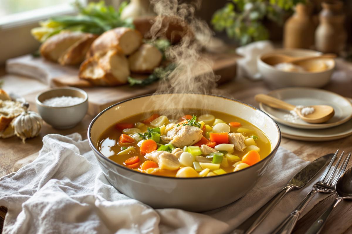Die Poule au Pot wird in tiefen Tellern serviert – reichlich Brühe, zartes Huhn, aromatisches Gemüse. Dazu passen grobkörniges Salz, schwarzer Pfeffer und Cornichons. Für ein echtes Frankreich-Feeling!