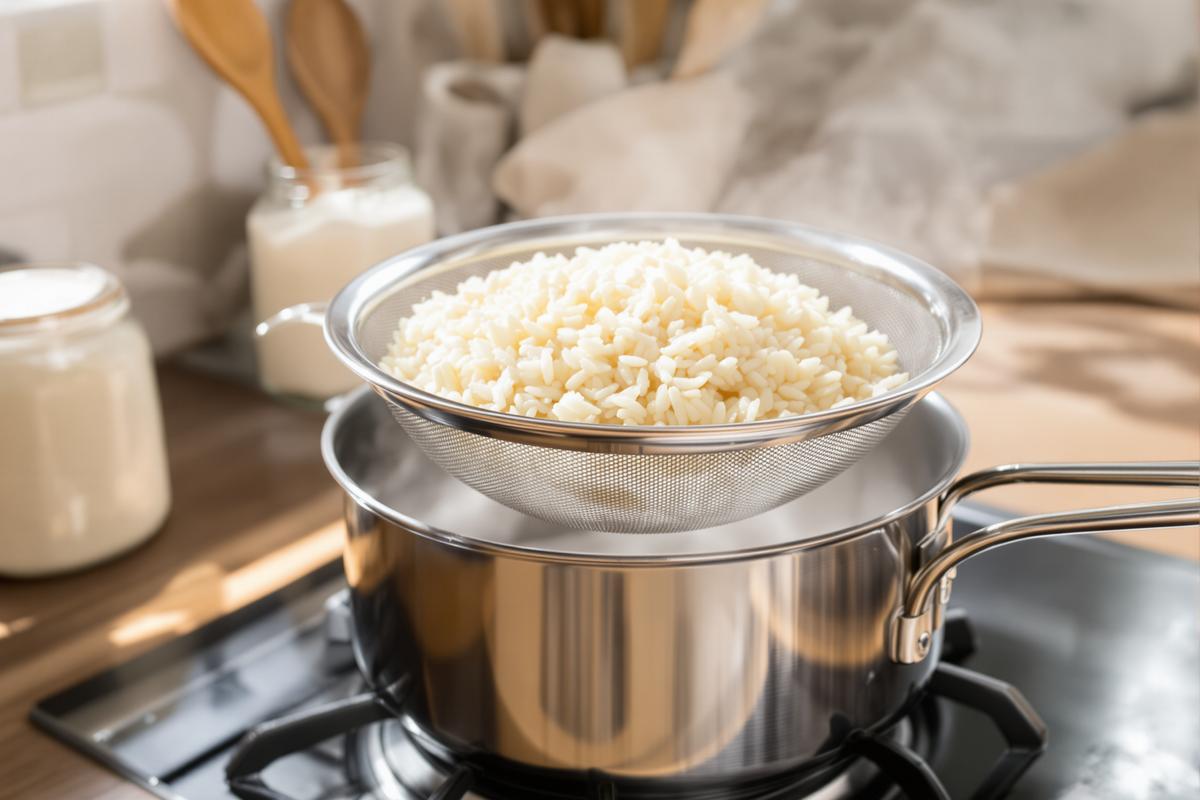 - 3. Sieb einsetzen: Gib den Reis in ein feinmaschiges Metallsieb und setze es so in den Topf, dass es im Wasser hängt, aber nicht den Boden berührt.
